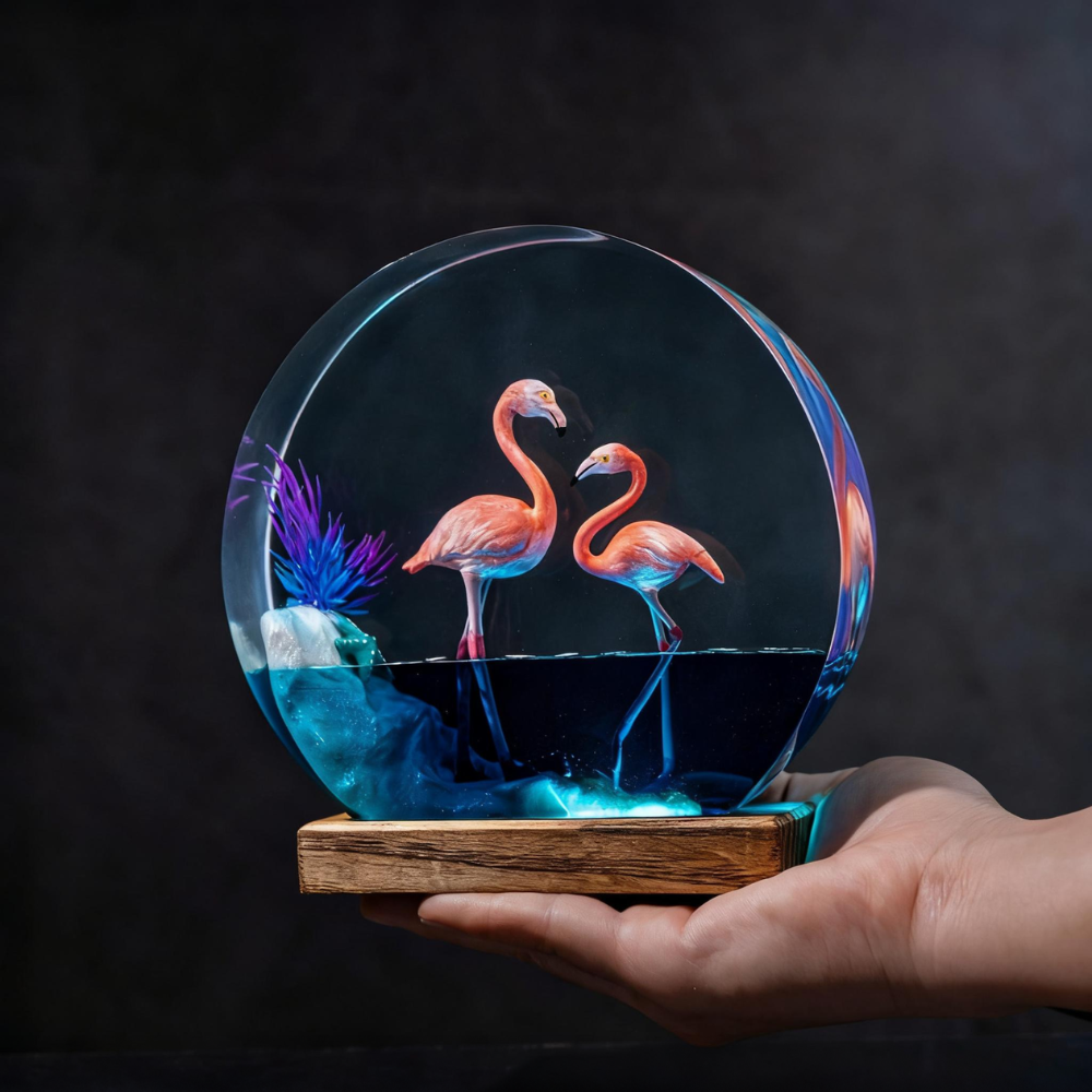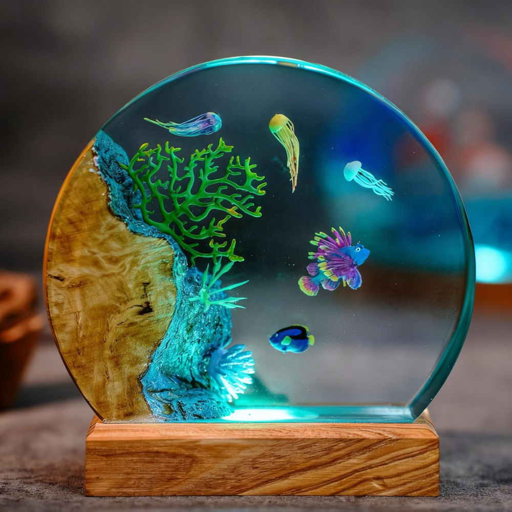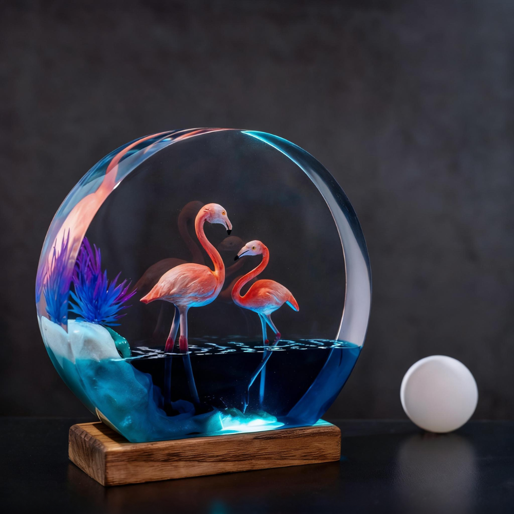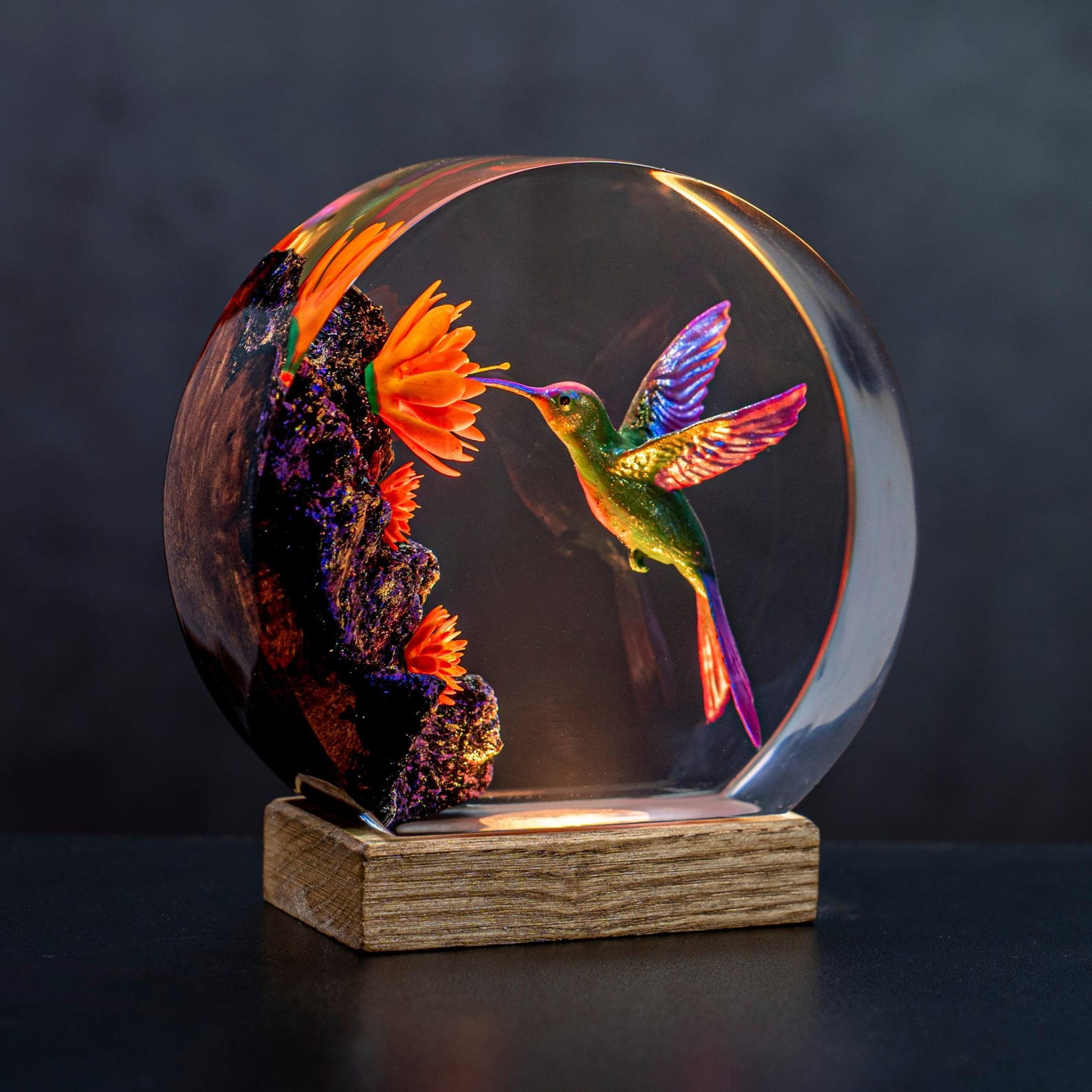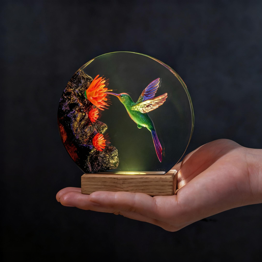 Hummingbird Resin Night Light Handmade Round with Wooden Base Christmas Gift